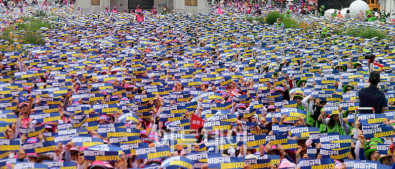 3일 서울 광화문 광장에서 학교비정규직노조 총파업 대회가 열린 가운데 참가자들이 구호를 외치고 있다. 고이란 기자 photoeran@