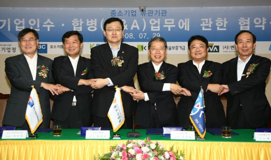 ▲기업은행은 중소기업청 등 유관기관과 함께 중소기업의 인수합병 관련 각종 업무를 지원할 '중소기업 M&A 지원센터'를 29일 기업은행 본점 내에 개설했다. 이날 출범식에는 홍석우(왼쪽 세번째) 중소기업청장과 윤용로(왼쪽 네번째) 기업은행장 등 유관기관 대표들이 참석해 적극적인 협력과 지원을 약속했다.