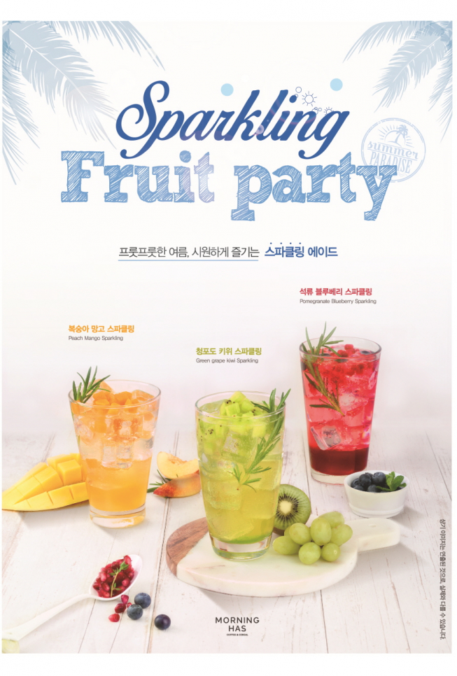‘복숭아 망고 스파클링’은 열대 과일 망고와 복숭아의 달콤한 조합을 느낄 수 있으며, ‘청포도 키위 스파클링’은 탱글탱글한 청포도와 새콤달콤한 키위의 상큼함을 입안 가득 즐길 수 있다. 진한 붉은빛이 매력적인 ‘석류 블루베리 스파클링’은 석류의 산뜻한 향과 블루베리 과육의 조화를 시원하게 살렸다.