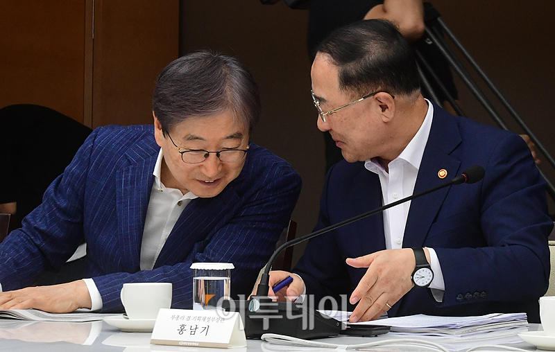 홍남기 경제부총리 겸 기획재정부 장관(오른쪽)과 윤부근 삼성전자 부회장이 4일 서울 중구 대한상공회의소에서 열린 하반기 경제정책 방향 기업인 간담회에서 대화하고 있다. 고이란 기자 photoeran@
