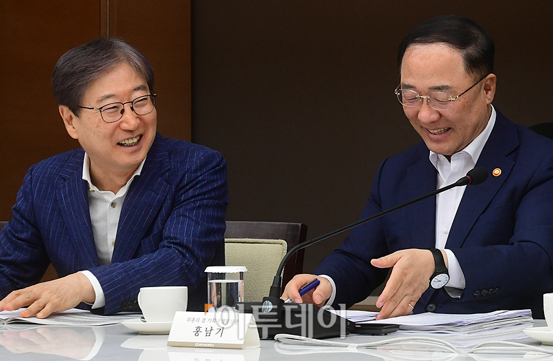 홍남기 경제부총리 겸 기획재정부 장관(오른쪽)과 윤부근 삼성전자 부회장이 4일 서울 중구 대한상공회의소에서 열린 하반기 경제정책 방향 기업인 간담회에서 대화하고 있다. 고이란 기자 photoeran@