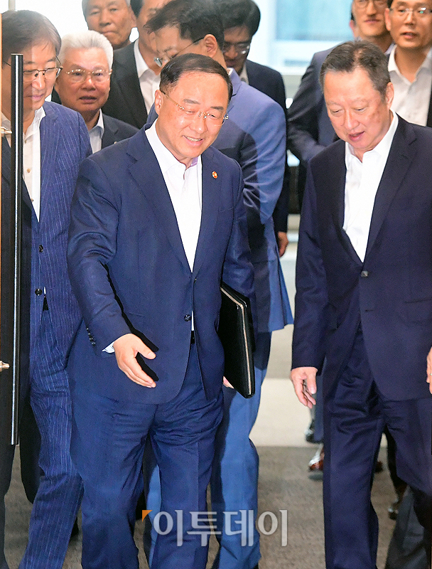 홍남기 경제부총리 겸 기획재정부 장관(가운데)이 4일 서울 중구 대한상공회의소에서 하반기 경제정책 방향 기업인 간담회에 박용만 대한상의 회장(오른쪽), 윤부근 삼성전자 부회장(왼쪽) 등 참석자들과 입장하고 있다. 고이란 기자 photoeran@