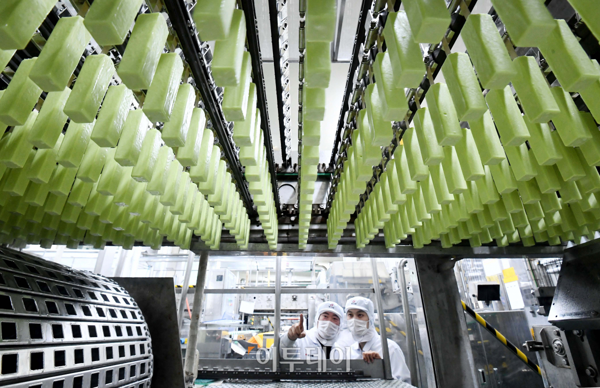장마가 소강상태에 접어들며 전국에 무더위가 지속되고 있는 가운데 4일 충남 논산시 가야곡면 빙그레 논산공장에서 관계자들이 아이스크림 제조 작업에 바쁜 일손을 놀리고 있다. 여름철 성수기 빙그레 논산공장에선 300여명의 직원들이 30종 하루 6만 상자의 아이스크림을 생산한다. 신태현 기자 holjjak@