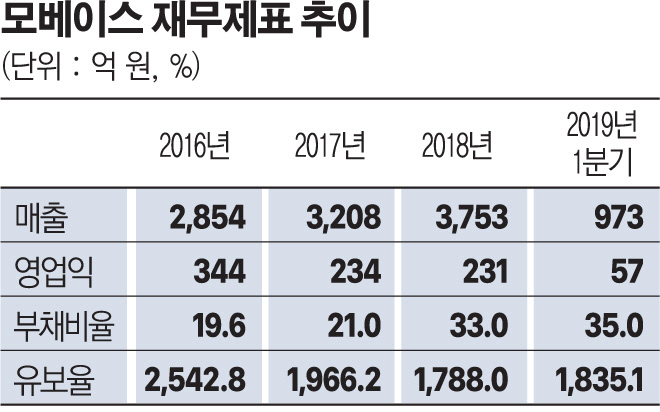 모베이스는 전방산업인 휴대폰 시장의 성장 둔화에도 비교적 양호한 실적을 내고 있다. 최근 4년간 성적을 보면 매출은 2016년 연결기준 2854억 원에서 지난해 3753억 원으로 성장했다. 올해 1분기에도 973억 원으로 전년 동기 대비 51% 신장했다. 수익성 측면에서도 우수한 편으로 영업이익은 같은 기간 200억~300억 원대를 유지하고 있다. 1분기에는 57억 원을 기록해 작년보다 101.4% 늘었다.