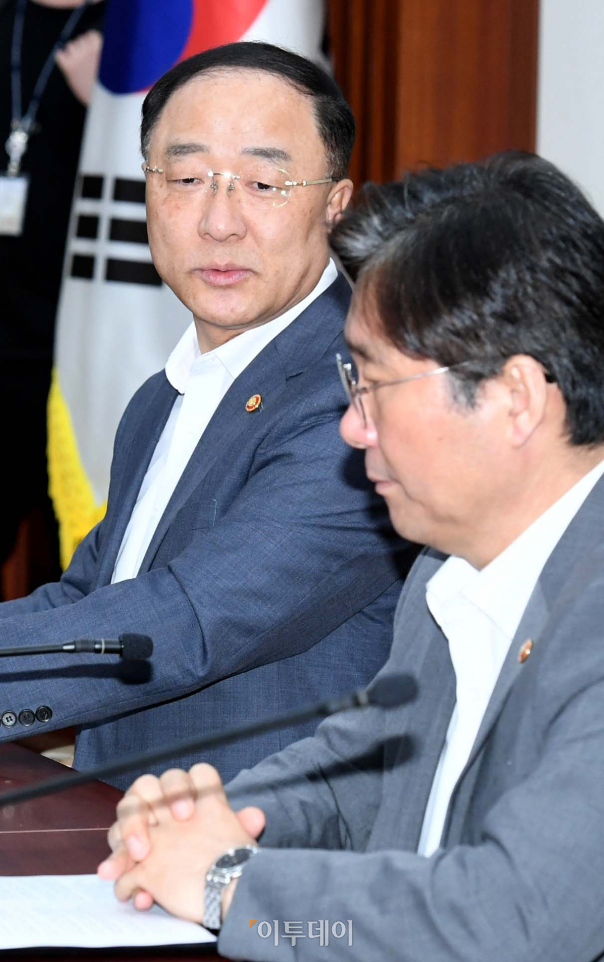 홍남기(왼쪽) 경제부총리 겸 기획재정부 장관이 8일 서울 종로구 세종대로 정부서울청사에서 열린 대외경제장관회의에 앞서 성윤모 산업통상자원부 장관과 대화하고 있다. 신태현 기자 holjjak@