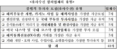 이에 따라 금감원은 불특정 다수인을 상대로 단기간 고수익을 보장한다며 불법적으로 자금을 모집하고 있는 것으로 추정된 유사수신 혐의업체 41개사를 적발, 경찰에 통보조치 했다.