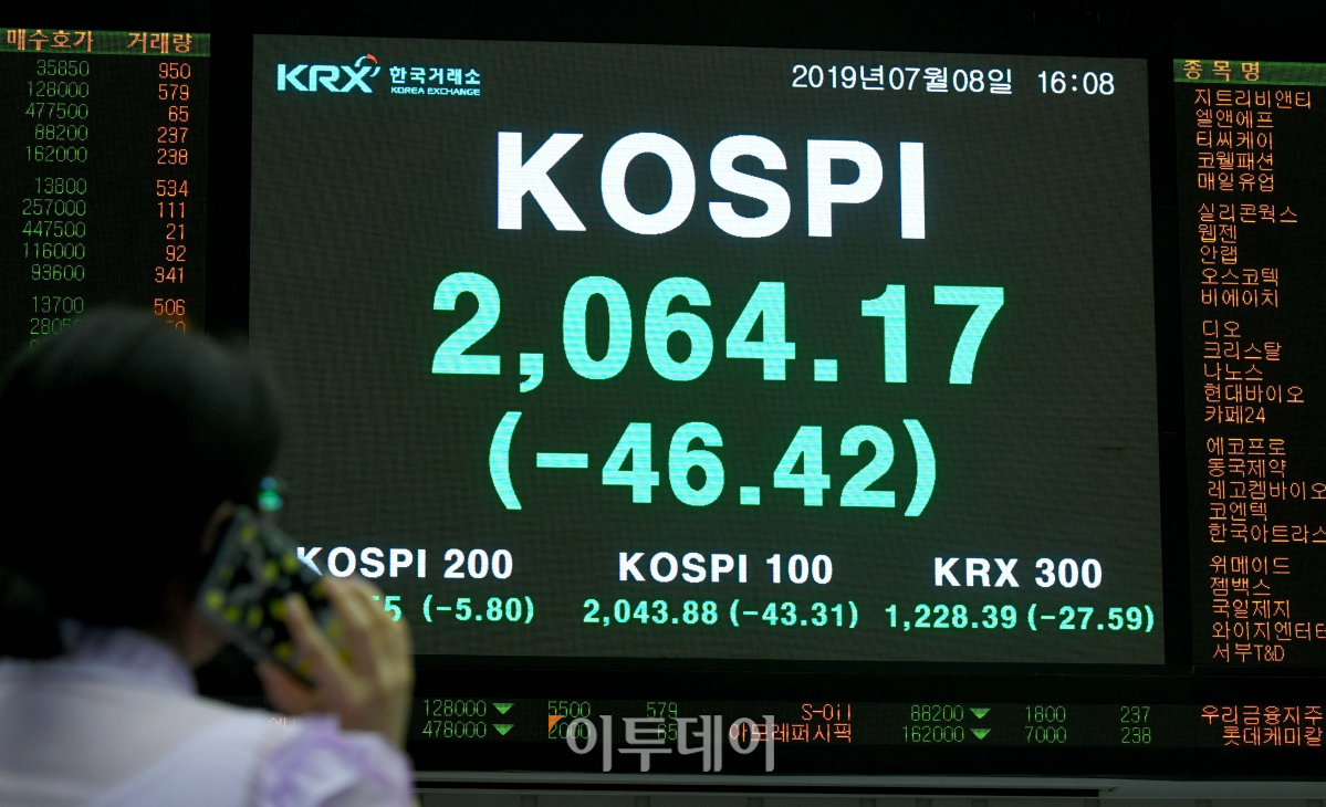 코스피가 외국인 선물 매도 급증에 따른 투자심리 악화 등으로 2% 넘게 급락한 8일 서울 영등포구 여의도 한국거래소(KRX) 서울사무소 전광판에 코스피지수가 전 거래일보다 46.42포인트(2.20%) 내린 2064.17을 가리키고 있다. 코스닥은 전 거래일보다 25.45포인트(3.67%) 내린 668.72로 거래를 마쳤다. 신태현 기자 holjjak@