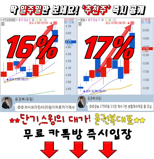 요즘 시장 많이 어렵습니다. 그래도 계속 혼자하시겠어요? 하루라도 빨리 수익내고 원금회복하고 싶지 않으세요? 일단 들어오세요. 오셔서 '윤권복대표'님의 리딩 받아보세요. 이분은 단기면 단기, 스윙, 중장기 모든 종목에 강합니다. 주식은 이제 윤권복대표에게 맡기시고 여러분은 편하게 수익 챙기세요. 오늘 단 하루 무료 카톡방 공개됩니다. 한번뿐인 기회 놓치지 마시고 지금 바로 입장하세요!