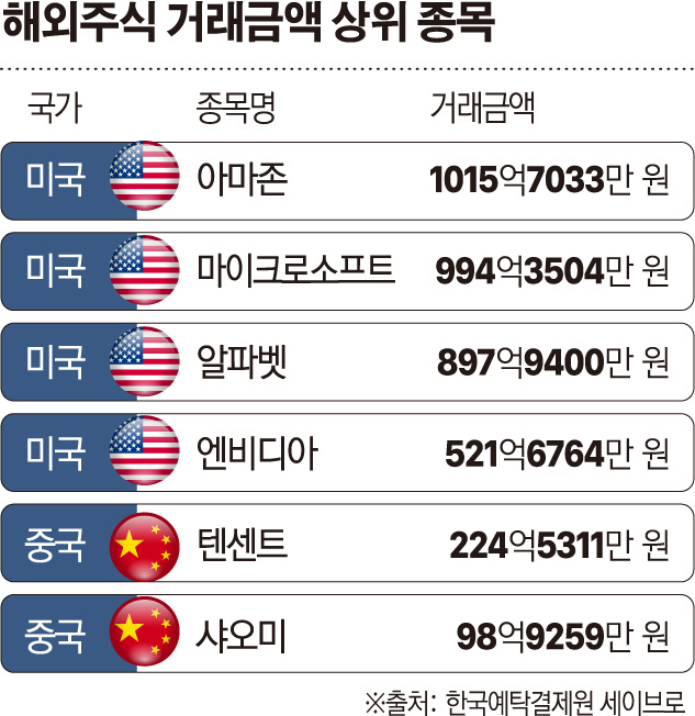 국내 투자자들은 최근 한달 동안 아마존, 마이크로소프트 등 미국 주식을 집중적으로 사들인 것으로 조사됐다. 아마존(1015억7033만 원), 마이크로소프트(994억3504만 원), 알파벳(897억9400만 원), 엔비디아(521억6764만 원) 등을 대량으로 구매한 것으로 조사됐다. 아마존과 마이크로소프트의 주가 역시 각각 4.42%, 3.36% 상승했다.