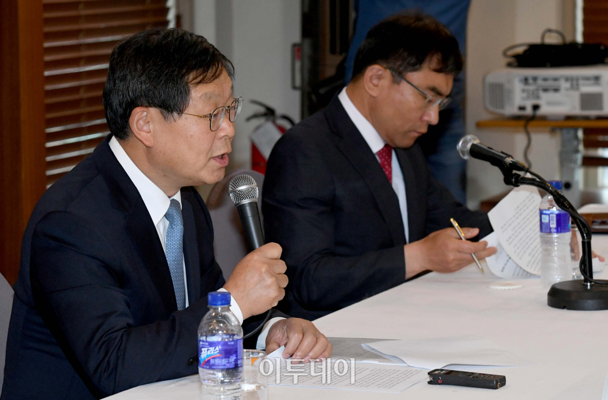 9일 서울 중구 세종대로 프레스센터에서 한국경영자총협회·중소기업중앙회·한국중견기업연합회 주최로 열린 ‘2020년 적용 최저임금 결정에 대한 주요 사용자단체 공동 기자회견’에서 김용근 경총 상근부회장이 발언하고 있다. 경영계는 이날 기자회견에서 그동안 가팔랐던 상승폭을 고려해 내년도 최저임금은 마이너스로 하향조정해야 한다는 입장을 밝혔다. 신태현 기자 holjjak@