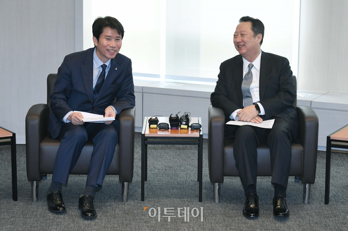 이인영(왼쪽) 더불어민주당 원내대표가 9일 서울 중구 세종대로 대한상공회의소를 찾아 박용만 대한상의 회장과 환담하고 있다. 신태현 기자 holjjak@