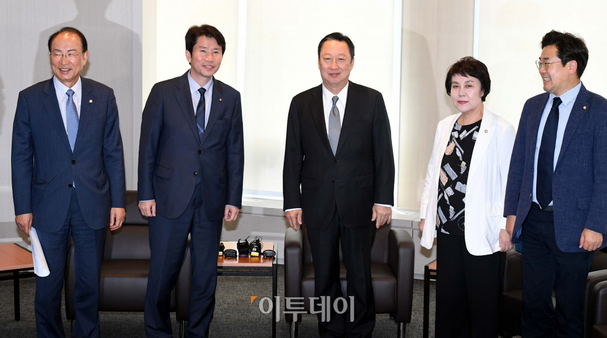 이인영(왼쪽 두번째) 더불어민주당 원내대표가 9일 서울 중구 세종대로 대한상공회의소를 찾아 박용만(가운데) 대한상의 회장과 환담에 앞서 기념촬영을 하고 있다. 신태현 기자 holjjak@