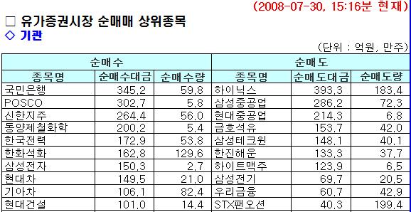 종목별로 기관들은 국민은행 345억원, POSCO 302억원, 신한지주 264억원, 동양제철화학 200억원 순으로 순매수 했으며 하이닉스 393억원, 삼성중공업 286억원, 현대중공업 214억원, 금호석유 153억원 순으로 순매도 했다.