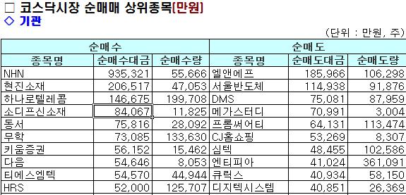 코스닥시장에서는 NHN 93억원, 현진소재 20억원, 하나로텔레콤 14억원, 소디프신소재 8억원 순으로 순매수 했으며 엘앤에프 18억원, 서울반도체 11억원, DMS 7억원, 메가스터디 7억원 순으로 순매도 했다.