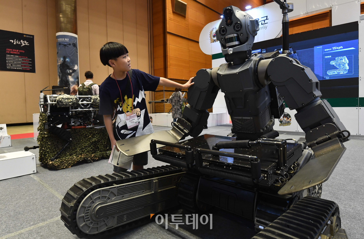 10일 서울 강남구 영동대로 코엑스에서 열린 ‘2019 무인이동체산업엑스포’에서 한 어린이 참관객이 육군 구난로봇을 살펴보고 있다. 오는 12일까지 진행되는 무인이동체산업엑스포는 드론과 자율주행차 등 무인이동체 분야의 최신 기술과 제품 등을 한눈에 살펴볼 수 있는 자리다. 신태현 기자 holjjak@