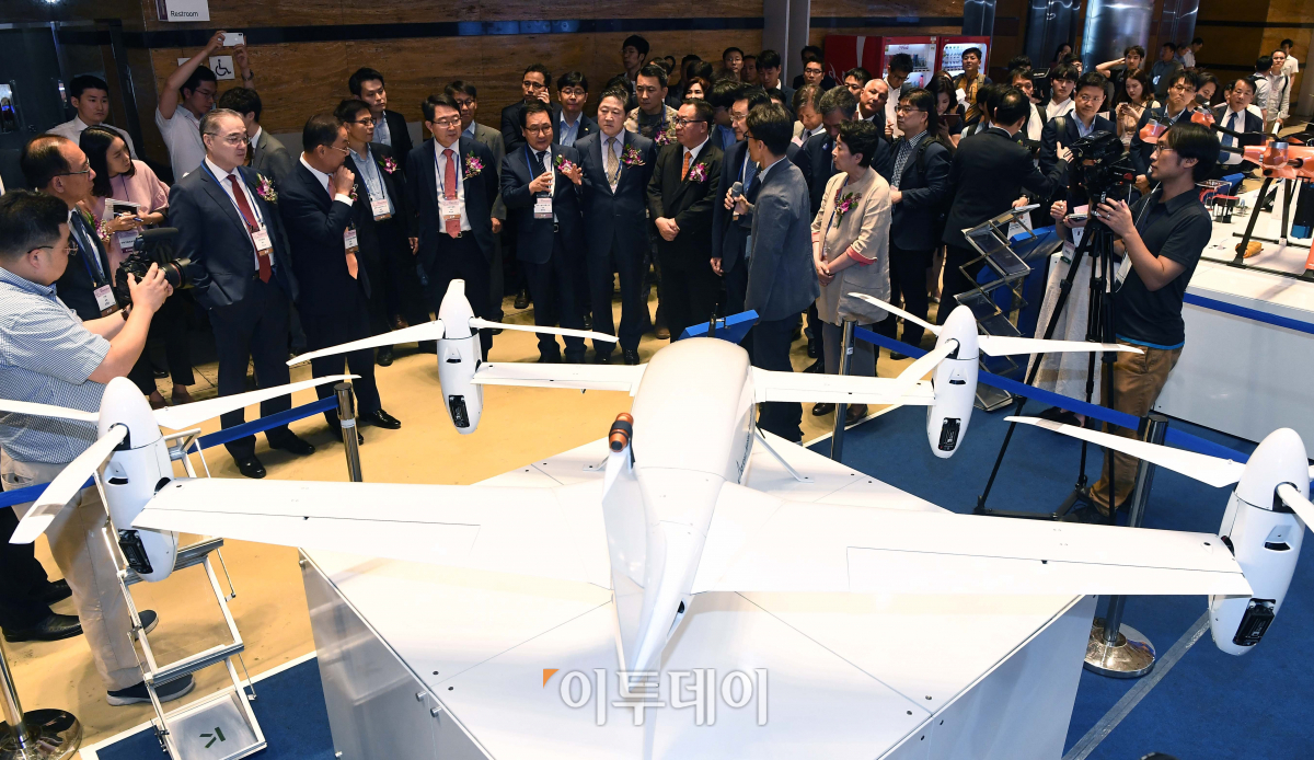 10일 서울 강남구 영동대로 코엑스에서 열린 ‘2019 무인이동체산업엑스포’에서 유영민 과기정통부 장관 등이 드론을 살펴보고 있다. 오는 12일까지 진행되는 무인이동체산업엑스포는 드론과 자율주행차 등 무인이동체 분야의 최신 기술과 제품 등을 한눈에 살펴볼 수 있는 자리다. 신태현 기자 holjjak@