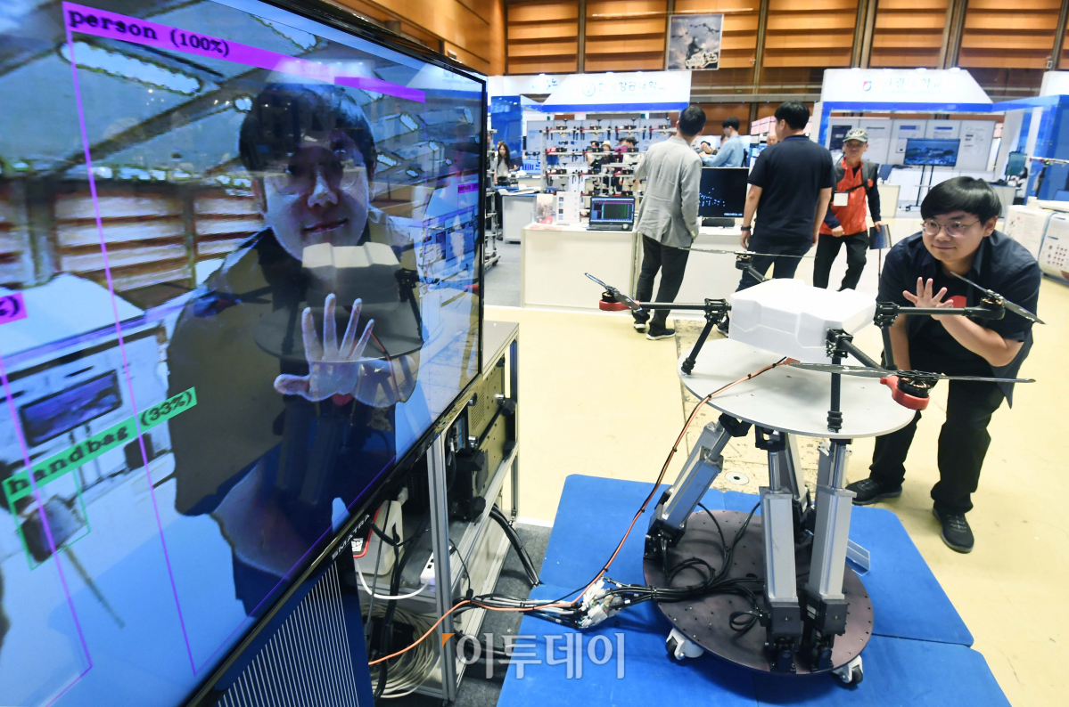 10일 서울 강남구 영동대로 코엑스에서 열린 ‘2019 무인이동체산업엑스포’ 부산대 부스에서 관계자가 드론에 탑재된 머신러닝 기반 인공지능(AI) 영상인식 시스템을 시연하고 있다. 오는 12일까지 진행되는 무인이동체산업엑스포는 드론과 자율주행차 등 무인이동체 분야의 최신 기술과 제품 등을 한눈에 살펴볼 수 있는 자리다. 신태현 기자 holjjak@
