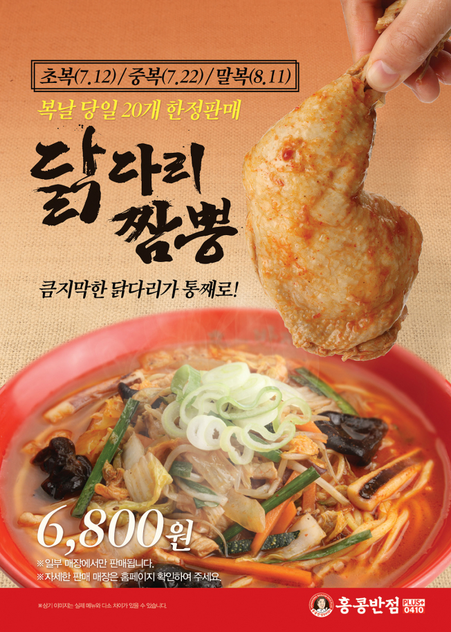 삼복 당일에 판매되는 닭다리짬뽕은 전국 홍콩반점0410 34개 매장에서 오전 11시부터 하루 20개 한정수량으로 만나볼 수 있으며, 정가는 6800원이다.