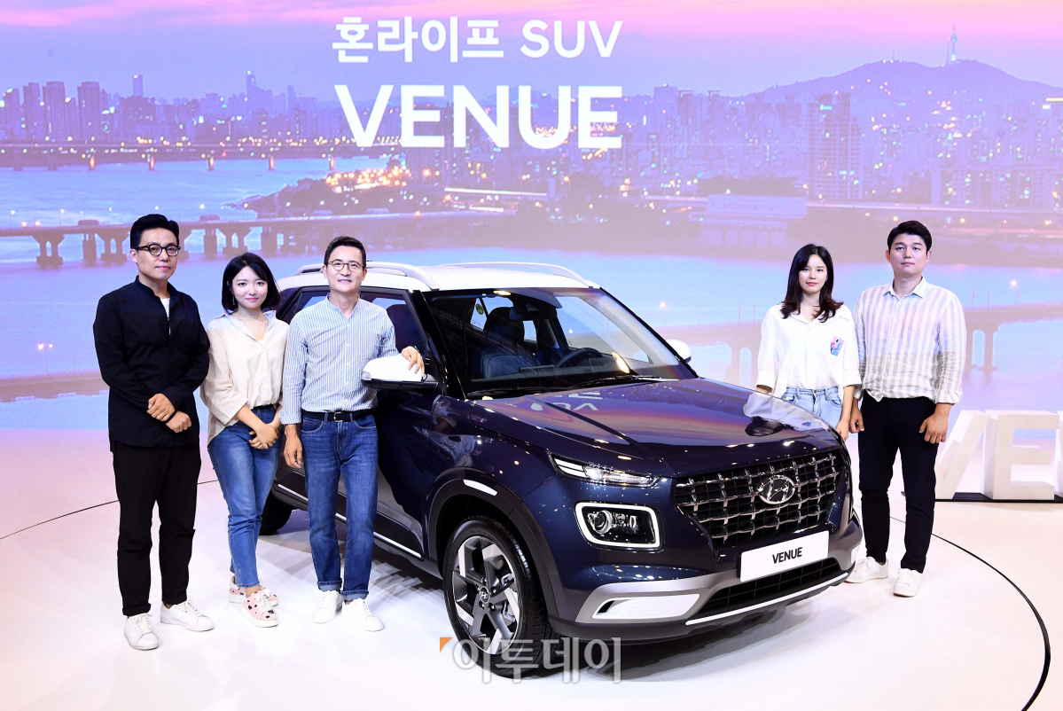 이광국 현대자동차 국내영업본부장(부사장) 등이 11일 경기 용인시 원고매로 카핑에서 열린 현대차 소형 SUV ‘베뉴(VENUE)’ 출시행사에서 차량을 소개하고 있다. 베뉴는 현대차의 최신 디자인 스타일을 감각적으로 담아낸 SUV로 세련되면서도 실용적인 삶을 추구하는 ‘밀레니얼 세대의 혼라이프’를 겨냥했으며, 스마트스트림 G1.6엔진에 스마트스트림 무단변속기를 결합해 최고출력 123마력, 최대토크 15.7㎏f·m의 힘을 낸다. 베뉴의 판매가격은 스마트 1473만원(수동변속기), 1620만원(무단변속기)·모던 1799만원·플럭스(FLUX) 2111만원이다. 신태현 기자 holjjak@