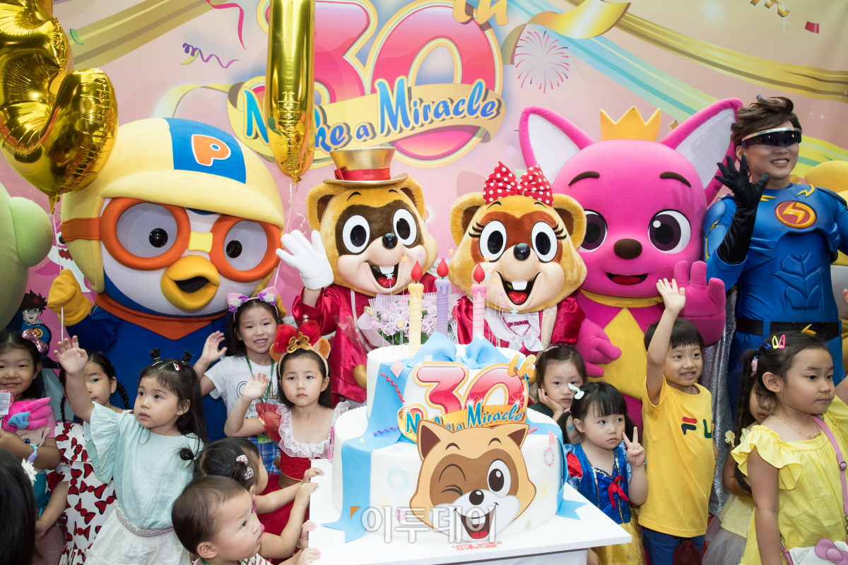 11일 서울 송파구 롯데월드 어드벤처 가든스테이지에서 열린 ‘롯데월드 어드벤처 30주년 생일파티’에서 로티, 로리, 뽀로로, 핑크퐁, 번개맨 등 대한민국 인기 캐릭터 들이 롯데월드의 생일을 축하하고 있다. 사진제공=롯데월드
