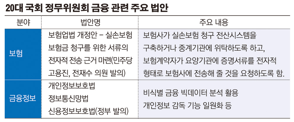 금융 혁신 법안이 국회에 발목 잡혔다. 실손의료보험 청구 간소화와 ‘데이터 3법’ 등 보험과 핀테크 분야 혁신 핵심법안은 논의를 시작조차 못한 상황이다. 금융업계는 “이번 기회를 놓치면 사실상 21대 국회를 기다려야 한다”며 한목소리로 우려했다.