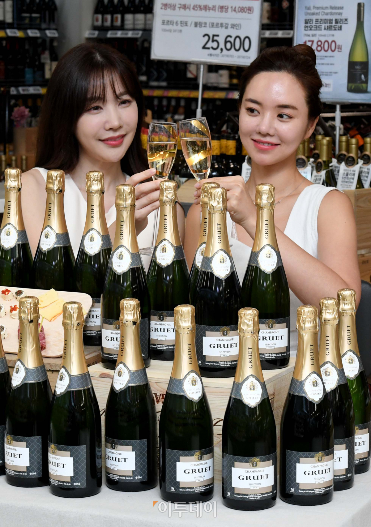 이마트가 15일 서울 용산구 한강대로 이마트 용산점에서 프랑스 샹파뉴 지방의 스파클링 와인인 ‘샴페인 그루에(Champagne Gruet)’를 선보이고 있다. 이마트는 1년 전부터 샹파뉴 전역의 와이너리를 접촉, 3만병 이상 대량 기획과 수입사 및 유통사 최소 마진으로 2만9800원 특가에 ‘샴페인 그루에’를 판매한다고 밝혔다. 신태현 기자 holjjak@
