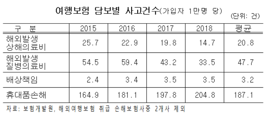 지난해 여행 중 상해사고로 해외 여행지에서 치료를 받은 경우는 가입자 1만명 당 14.7건, 질병치료는 33.5건으로 지난 4년간 감소하는 추세를 보였다. 반면 휴대품손해 사고는 가입자 1만명 당 204.8건, 배상책임 사고는 3.5건으로 2015년 각각164.9건과 2.4건보다 증가했다.