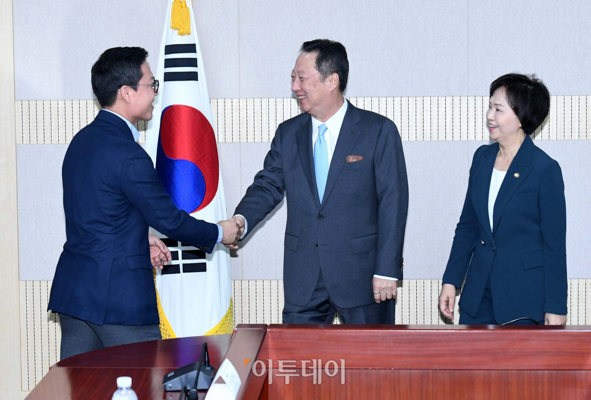 박용만(왼쪽 두번째) 대한상공회의소 회장이 15일 서울 양천구 목동중앙로 서울지방식품의약품안전청을 찾아 이의경(오른쪽) 식품의약품안전처장에게 공유 주방 규제 완화에 대한 감사 인사를 전하기 앞서 김기웅 위쿡 대표와 악수하고 있다. 식약처는 지난 11일 ICT 규제샌드박스 심의위원회를 통해 1개 주방을 다수 사업자가 이용할 수 있도록 규제를 완화했다. 신태현 기자 holjjak@