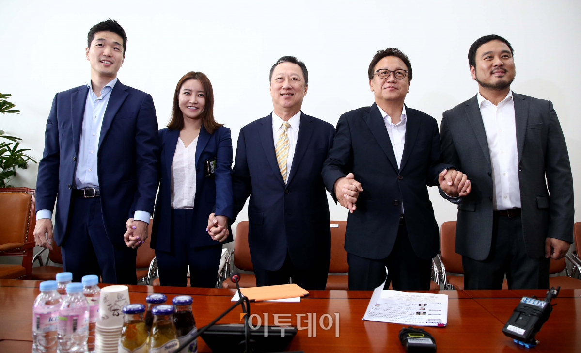 박용만 대한상공회의소 회장이 스타트업 최고경영자(CEO)들과 함께 16일 서울 여의도 국회를 찾아 민병두 정무위원장과 면담에 앞서 기념촬영을 하고 있다. 이 자리에서 박 회장과 스타트업 대표들은 스타트업 지원 및 규제에 관한 건의사항을 전달했다. 왼쪽부터 김성준 렌딧 대표, 손보미 콰라소프트 대표, 박 회장, 민 위원장, 류준우 보맵 대표. 신태현 기자 holjjak@
