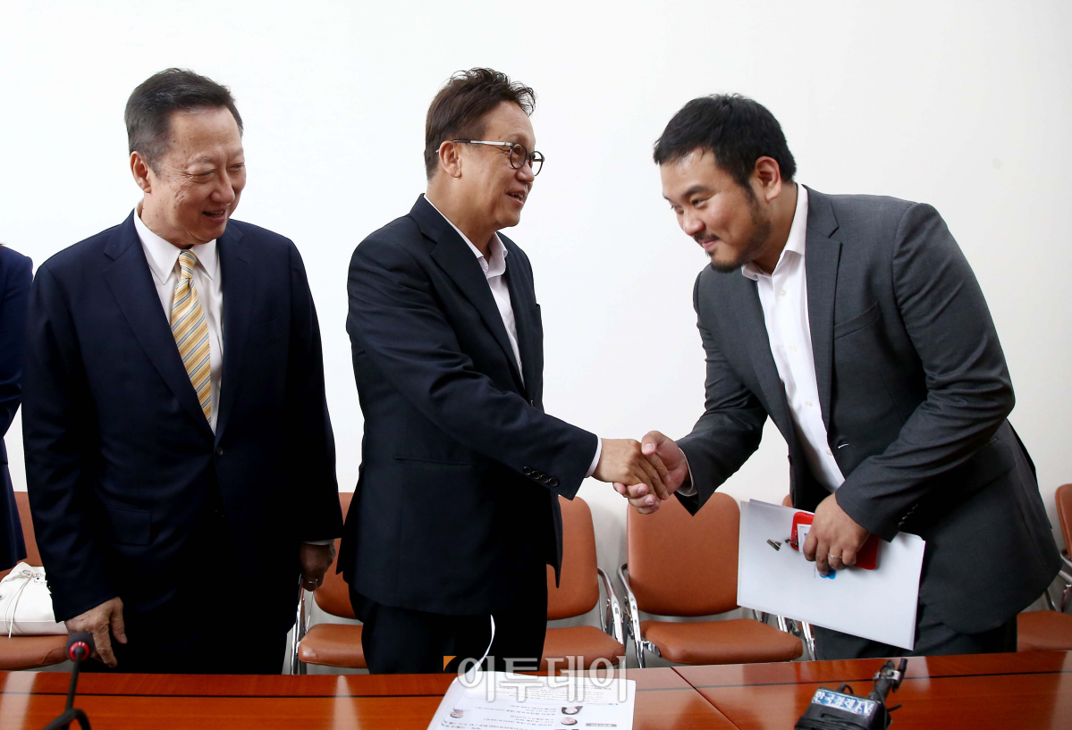 민병두 국회 정무위원장이 16일 서울 여의도 국회를 찾은 박용만 대한상공회의소 회장, 스타트업 최고경영자(CEO)들과 인사를 하고 있다. 자리에서 박 회장과 스타트업 대표들은 스타트업 지원 및 규제에 관한 건의사항을 전달했다. 신태현 기자 holjjak@