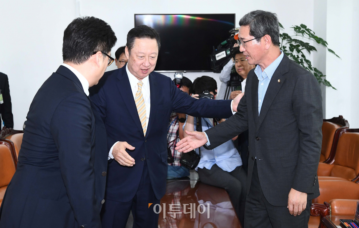 박용만(왼쪽) 대한상공회의소 회장이 한정훈 홈스토리생활 대표와 함께 16일 서울 여의도 국회를 찾아 김학용 환노위원장과 면담에 앞서 인사하고 있다. 이 자리에서 박 회장과 한 대표는 스타트업 지원 및 규제에 관한 건의사항을 전달했다. 신태현 기자 holjjak@