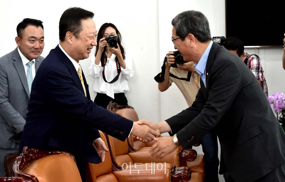 박용만(왼쪽) 대한상공회의소 회장이 한정훈 홈스토리생활 대표와 함께 16일 서울 여의도 국회를 찾아 김학용 환노위원장과 면담에 앞서 악수하고 있다. 이 자리에서 박 회장과 한 대표는 스타트업 지원 및 규제에 관한 건의사항을 전달했다. 신태현 기자 holjjak@