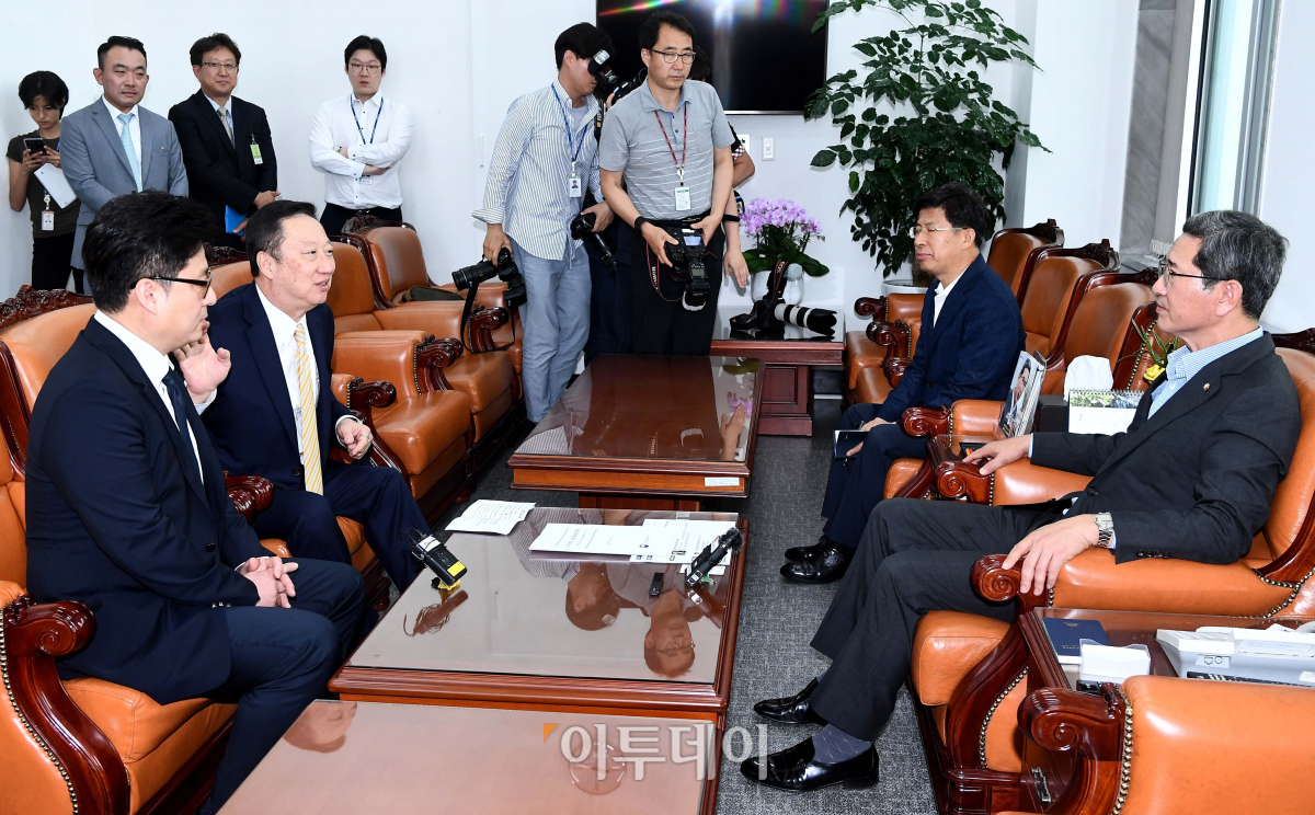 박용만 대한상공회의소 회장이 한정훈 홈스토리생활 대표와 함께 16일 서울 여의도 국회를 찾아 김학용 환노위원장과 면담하고 있다. 이 자리에서 박 회장과 한 대표는 스타트업 지원 및 규제에 관한 건의사항을 전달했다. 신태현 기자 holjjak@