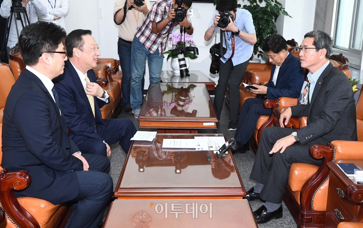 박용만 대한상공회의소 회장이 한정훈 홈스토리생활 대표와 함께 16일 서울 여의도 국회를 찾아 김학용 환노위원장과 면담하고 있다. 이 자리에서 박 회장과 한 대표는 스타트업 지원 및 규제에 관한 건의사항을 전달했다. 신태현 기자 holjjak@