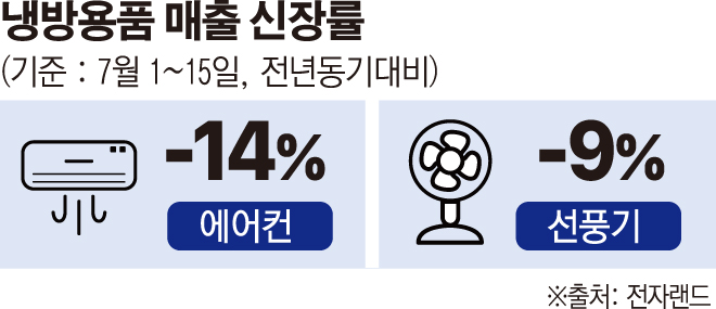 16일 전자랜드에 따르면 이달 들어 15일까지 에어컨 판매량은 지난해 같은 기간에 비교해 14%, 선풍기 판매는 9% 각각 감소했다. 11번가에서도 최근 한 달( 6월 16일~7월 15일) 사이 에어컨 매출 신장률이 전년보다 15% 줄었고, 선풍기 역시 16% 감소했다. 다만 써큘레이터 매출은 12% 증가했다.