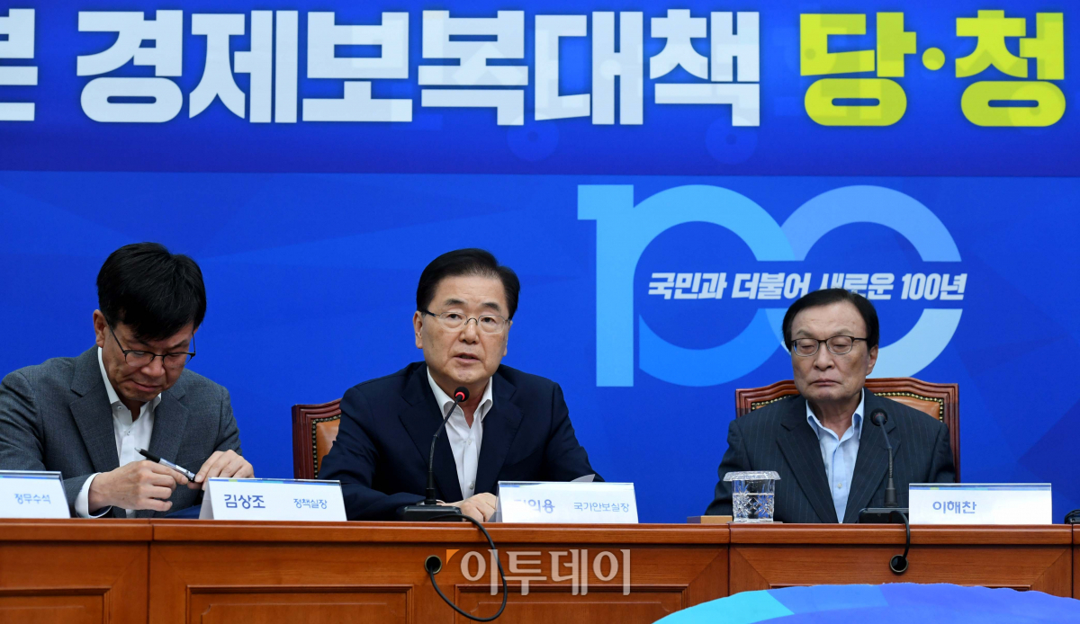 정의용 국가안보실장이 16일 서울 여의도 국회에서 열린 일본 경제보복대책 당·청 연석회의에서 발언하고 있다. 신태현 기자 holjjak@