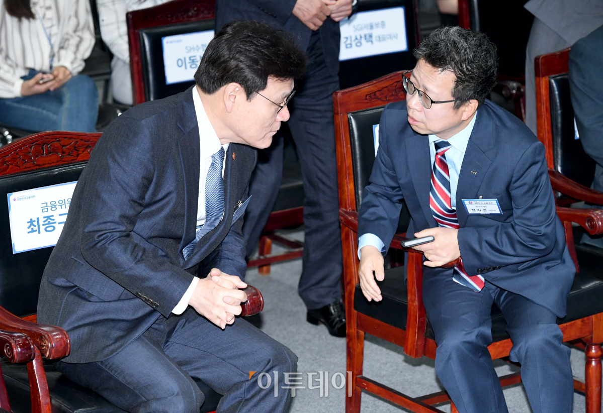 이투데이 미디어 주최 '제6회 대한민국 금융대전'이 17일 서울 강남구 삼성동 코엑스 C홀에서 성황리에 개막한 가운데 최종구(왼쪽) 금융위원장과 정지원 한국거래소 이사장이 대화를 하고 있다. 오는 18일까지 열리는 이번 행사는 '핀테크 챌린지 쇼'를 주제로 금융권의 디지털 플랫폼을 경험하고 관련 기업의 혁신 기술을 체험할 수 있는 장이 펼쳐진다. 핀테크 랩 투자유치 설명회를 비롯해 예비 창업자를 위한 다양한 강연과 금융권 취업을 희망하는 청년들을 위한 모의 면접도 진행한다. 신태현 기자 holjjak@