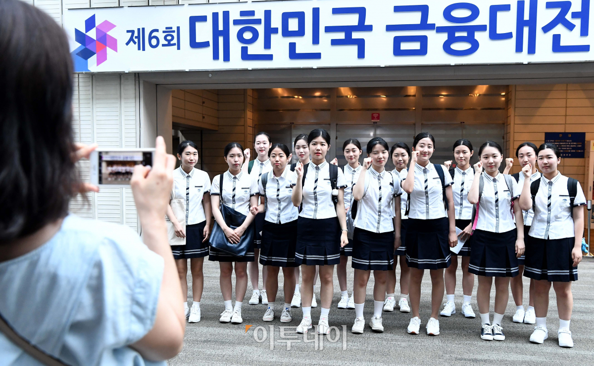 17일 서울 강남구 삼성동 코엑스 C홀에서 열린 '제6회 대한민국 금융대전'을 찾은 학생 참관객들이 기념촬영을 하고 있다. 이투데이 미디어 주최로 오는 18일까지 진행되는 이번 행사는 '핀테크 챌린지 쇼'를 주제로 금융권의 디지털 플랫폼을 경험하고 관련 기업의 혁신 기술을 체험할 수 있는 장이 펼쳐진다. 핀테크 랩 투자유치 설명회를 비롯해 예비 창업자를 위한 다양한 강연과 금융권 취업을 희망하는 청년들을 위한 모의 면접도 진행한다. 신태현 기자 holjjak@