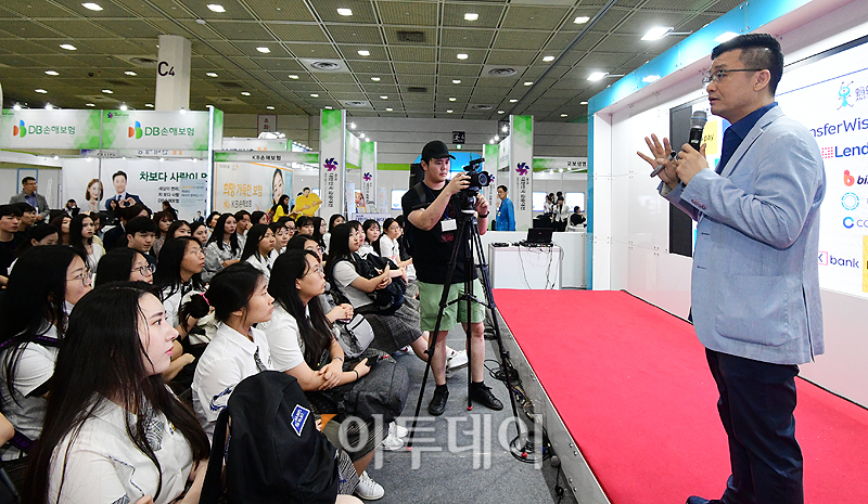 이투데이 미디어가 주최하는 '제6회 대한민국 금융대전'이 17일 서울 강남구 삼성동 코엑스 C홀에서 성황리에 개막한 가운데 석의현 커리어빅 대표가 '은행을 JOB아라!'를 주제로 은행권 취업전략에 대해 강연하고 있다. 오는 18일까지 열리는 이번 행사는 '핀테크 챌린지 쇼'를 주제로 금융권의 디지털 플랫폼을 경험하고 관련 기업의 혁신 기술을 체험할 수 있는 장이 펼쳐진다. 핀테크 랩 투자유치 설명회를 비롯해 예비 창업자를 위한 다양한 강연과 금융권 취업을 희망하는 청년들을 위한 모의 면접도 진행한다. 고이란 기자 photoeran@