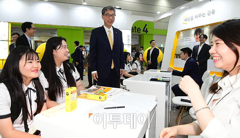 이투데이 미디어가 주최하는 '제6회 대한민국 금융대전'이 17일 서울 강남구 삼성동 코엑스 C홀에서 성황리에 개막한 가운데 허인 KB국민은행장이 부스에서 관람객들과 대화를 하고 있다. 오는 18일까지 열리는 이번 행사는 '핀테크 챌린지 쇼'를 주제로 금융권의 디지털 플랫폼을 경험하고 관련 기업의 혁신 기술을 체험할 수 있는 장이 펼쳐진다. 핀테크 랩 투자유치 설명회를 비롯해 예비 창업자를 위한 다양한 강연과 금융권 취업을 희망하는 청년들을 위한 모의 면접도 진행한다. 고이란 기자 photoeran@