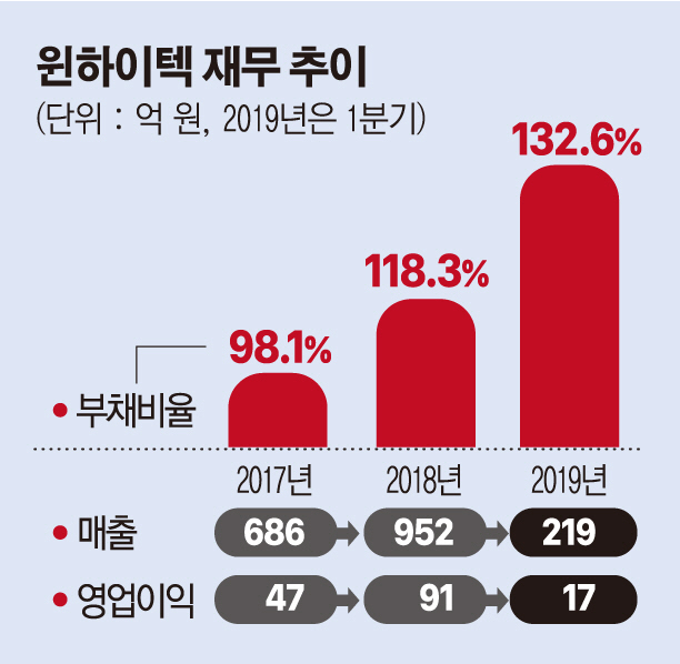 17일 금융감독원 전자공시시스템에 따르면 윈하이텍의 부채비율이 최근 수년간 급격하게 증가하고 있다. 2015~2016년 20%대에 불과했지만 2017년 98.1%, 2018년 118.3%, 올해 1분기는 132.6%로 늘어났다.