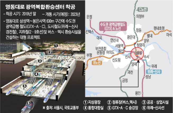 이 사업은 오는 2023년까지 지하 6층, 잠실야구장의 30배(연면적 16만㎡)에 달하는 국내 최대 규모의 지하공간을 조성하는 대형 프로젝트다. 수도권광역급행철도(GTX-A·C), 도시철도(위례~신사 경전철), 지하철(2·9호선) 및 버스·택시 환승시설이 들어설 예정이다.