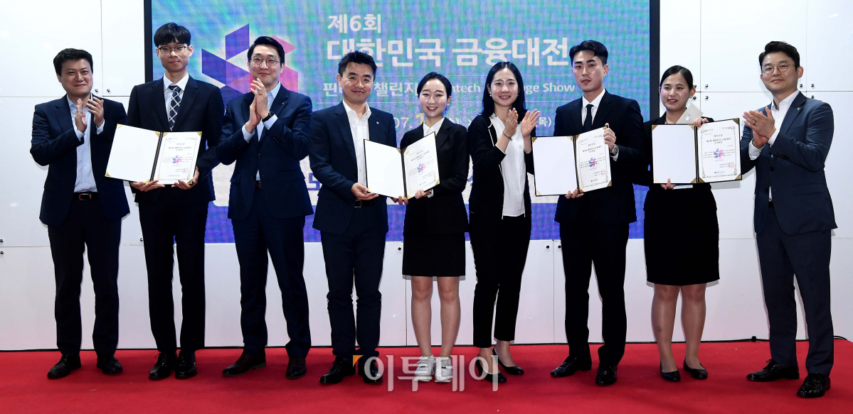 18일 서울 강남구 삼성동 코엑스 C홀에서 열린 '제6회 대한민국 금융대전'에서 은행권 모의면접 수상자들이 시중은행 인사담당자와 기념촬영을 하고 있다. 이투데이 미디어가 주최한 이번 행사에선 '핀테크 챌린지 쇼'를 주제로 금융권의 디지털 플랫폼을 경험하고 관련 기업의 혁신 기술을 체험할 수 있는 장이 펼쳐진다. 핀테크 랩 투자유치 설명회를 비롯해 예비 창업자를 위한 다양한 강연과 금융권 취업을 희망하는 청년들을 위한 모의 면접도 진행됐다. 신태현 기자 holjjak@