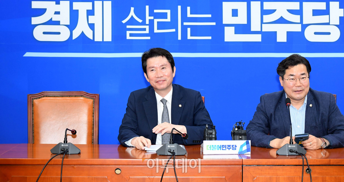 이인영 더불어민주당 원내대표가 21일 서울 여의도 국회에서 기자간담회를 갖고 추가경정예산(추경)안의 처리 방향 등에 대한 입장을 밝히고 있다. 신태현 기자 holjjak@