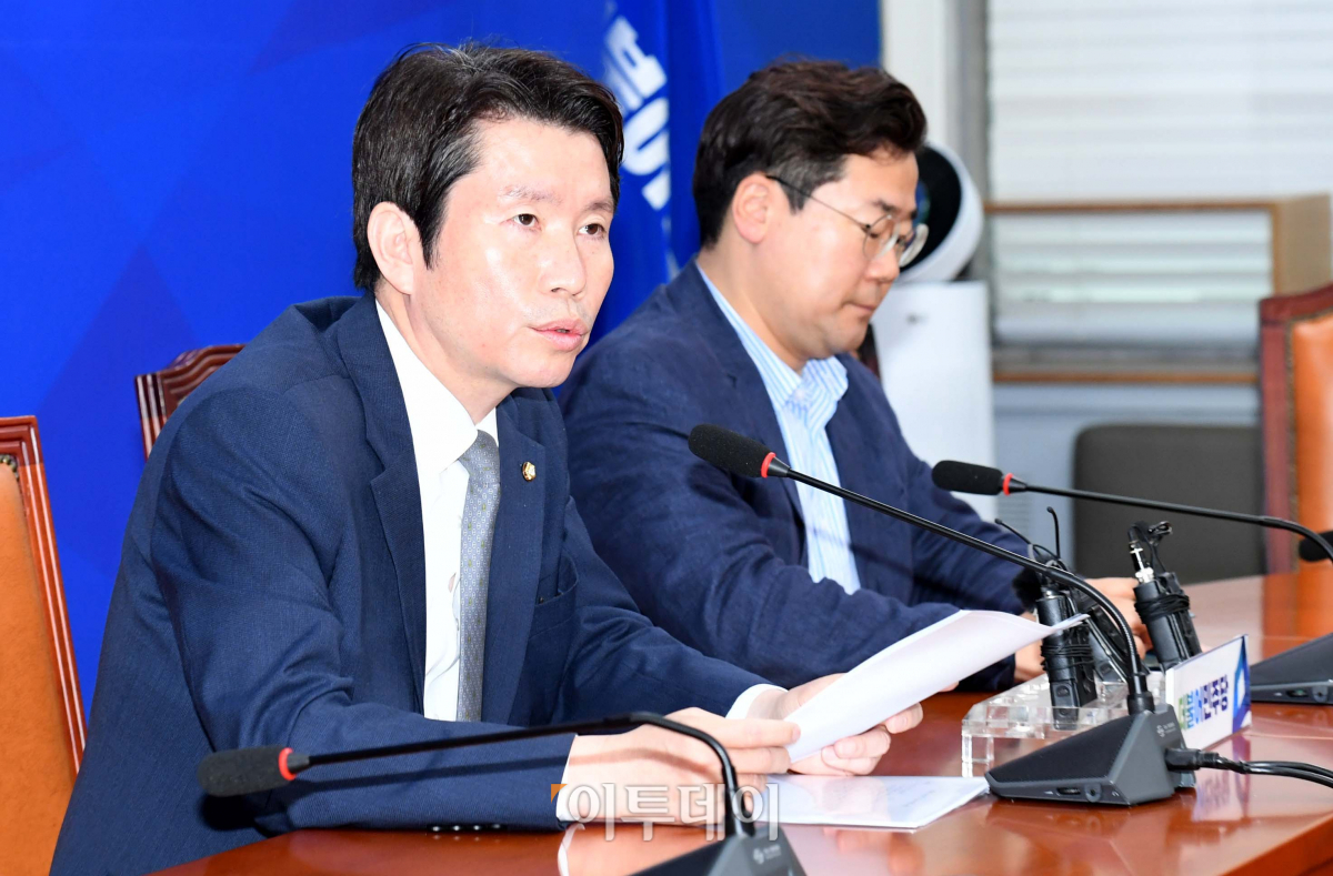 이인영 더불어민주당 원내대표가 21일 서울 여의도 국회에서 기자간담회를 갖고 추가경정예산(추경)안의 처리 방향 등에 대한 입장을 밝히고 있다. 신태현 기자 holjjak@