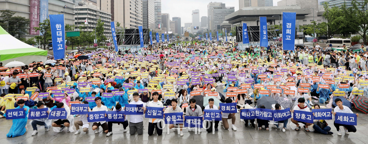 서울지역 8개 자율형사립고에 대한 교육청의 청문을 하루 앞둔 21일 서울 종로구 광화문광장에서 서울 자사고 학부모 연합회(자학연) 주최로 열린 ‘자사고 청소년 동아리 문화 축제’에서 학부모와 학생들이 자사고 지정 취소 반대 구호를 외치고 있다. 학생들의 공연 등 자사고 교육성과를 알리는 축제형식 집회로 진행된 이날 자사고 청소년 동아리 문화 축제에서 학부모와 학생들은 자사고가 입시 위주 교육만 하는 것이 아니라며 동의 없는 폐지는 불가하다고 주장했다. 신태현 기자 holjjak@
