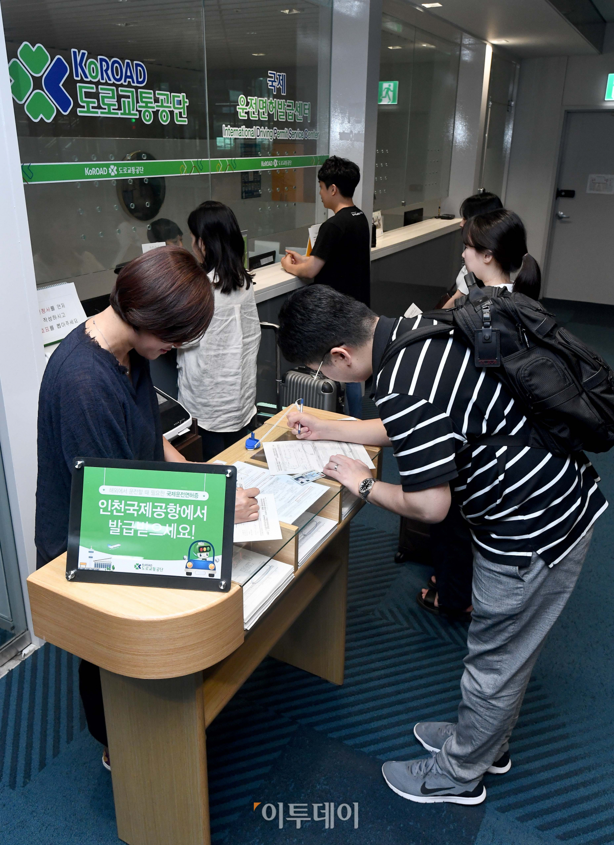 본격적인 여름 휴가철에 접어든 22일 인천 중구 인천국제공항 제2여객터미널 국제운전면허발급센터에서 시민들이 국제운전면허증을 발급받고 있다. 도로교통공단은 이달부터 인천공항 제2터미널에도 국제운전면허발급센터를 개소하고 국제운전면허 발급과 자동차 운전면허 적성검사 연기신청 등 운전면허 행정서비스를 제공하고 있다. 신태현 기자 holjjak@