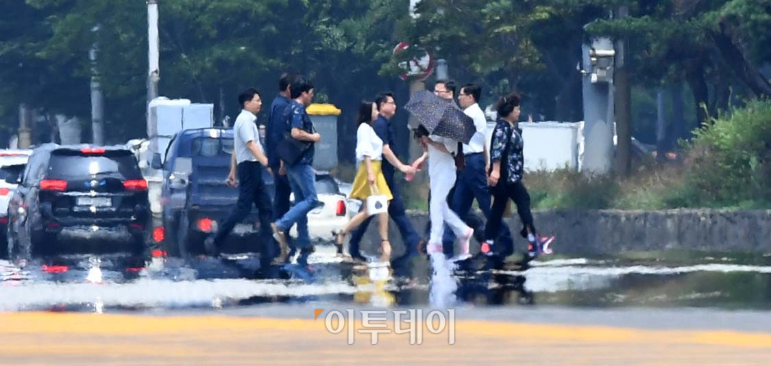 중복(中伏)인 22일 서울 낮 최고기온이 32도, 대구가 34도를 기록하는 등 전국 대부분 지역에 폭염주의보가 발효된 가운데 서울 영등포구 여의도의 한 거리에 지열로 인한 아지랑이가 피어오르고 있다. 신태현 기자 holjjak@