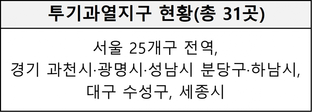 앞서 정부는 2017년 8월 3일 서울 25개 구, 세종을 투기과열지구ㆍ투기지역으로, 과천은 투기과열지구로 지정했다. 같은 해 9월 6일 성남시 분당구와 대구시 수성구가 투기과열지구로 추가 지정됐다. 이듬해 8월 28일에는 경기도 광명시와 하남시가 투기과열지구에 포함됐다.
