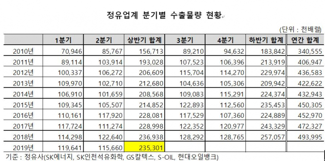 대한석유협회는 SK에너지, GS칼텍스, 에쓰오일(S-OIL), 현대오일뱅크 등 국내 정유업계가 올 상반기에 수출한 석유제품은 전년동기 대비 0.7% 감소한 2억3530만 배럴을 기록했다고 24일 밝혔다. 이는 지난해 상반기에 이은 역대 두 번째 수출량에 해당한다.